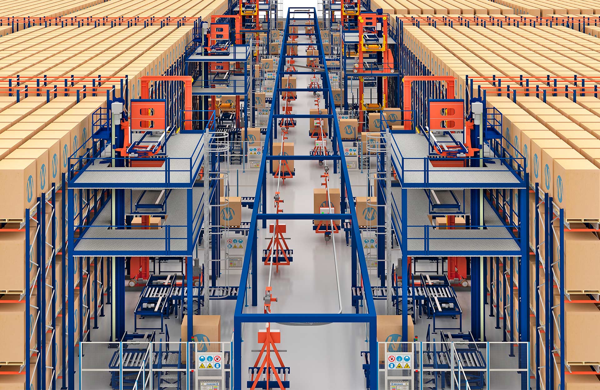The electric monorail speeds up the internal flow of pallets without operator intervention. The products arrive at their storage and retrieval positions automatically, and their entry and exit from the AS/RS is much faster and more streamlined.