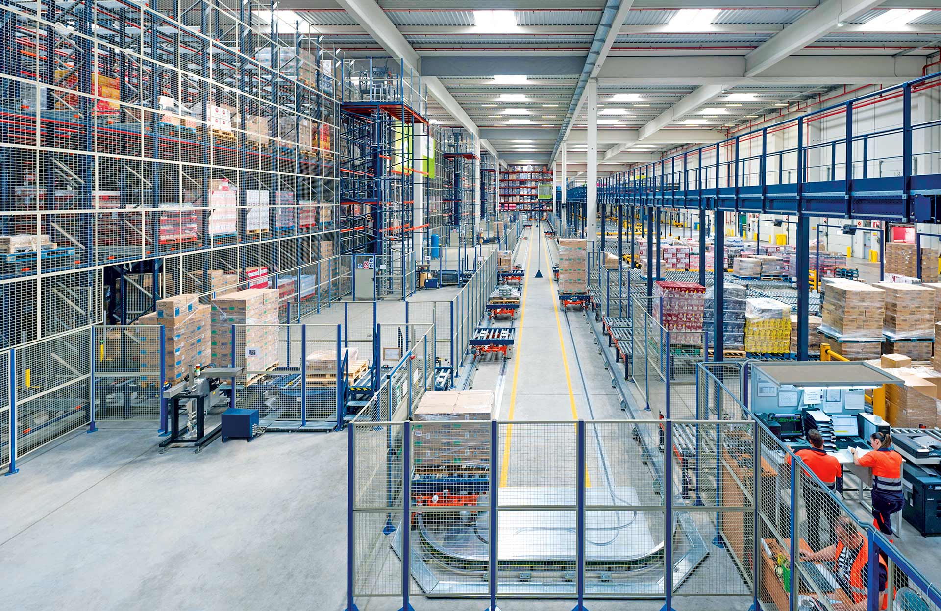 An electric monorail is an automated discontinuous pallet transport system consisting of trolleys driven by an electric motor. These vehicles move along a closed circuit of electrified rails, transferring pallets between the various loading and unloading stations located at different points along the route. This highly agile, effective solution covers long distances, considerably speeding up the internal transport of palletised loads. It can be tailored to the requirements of different types of warehouses.