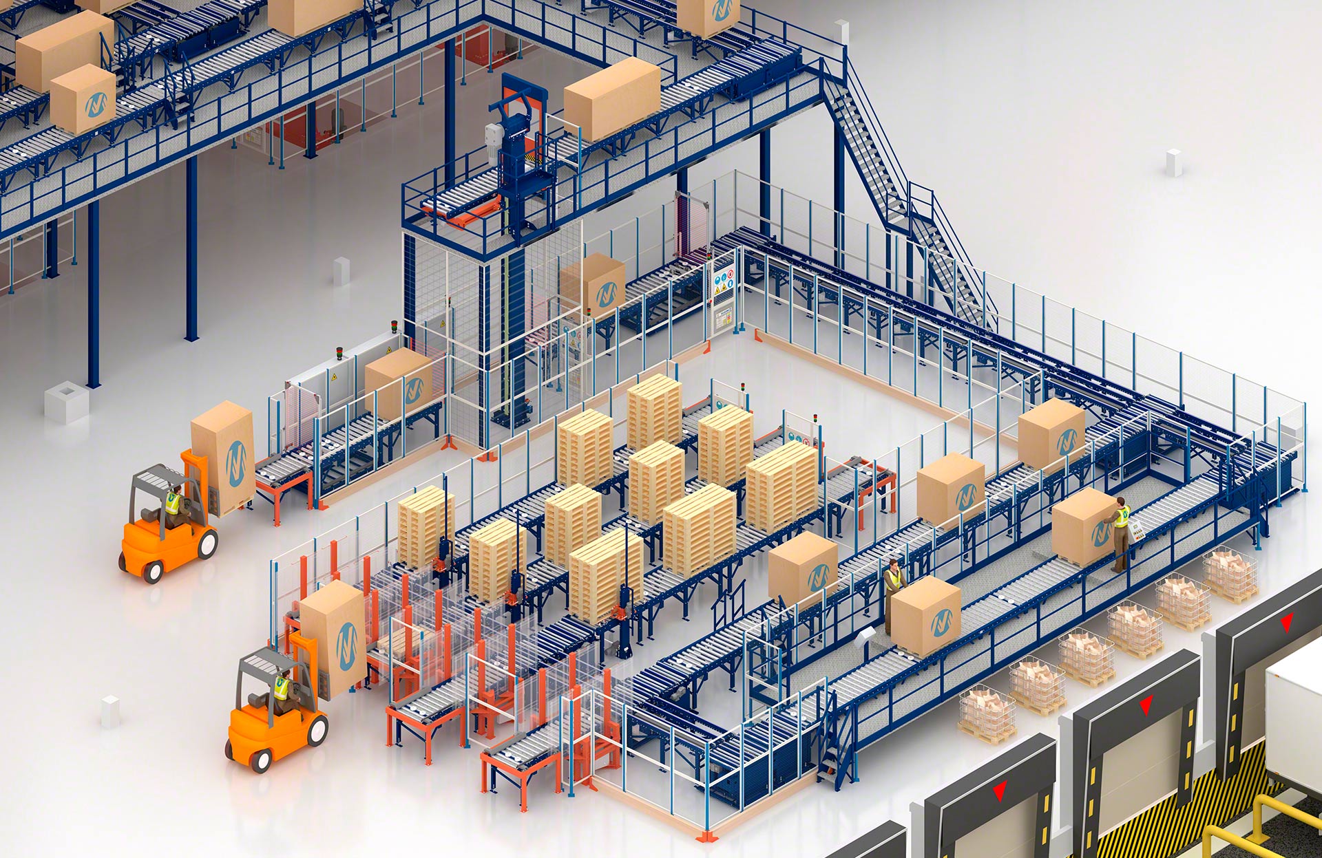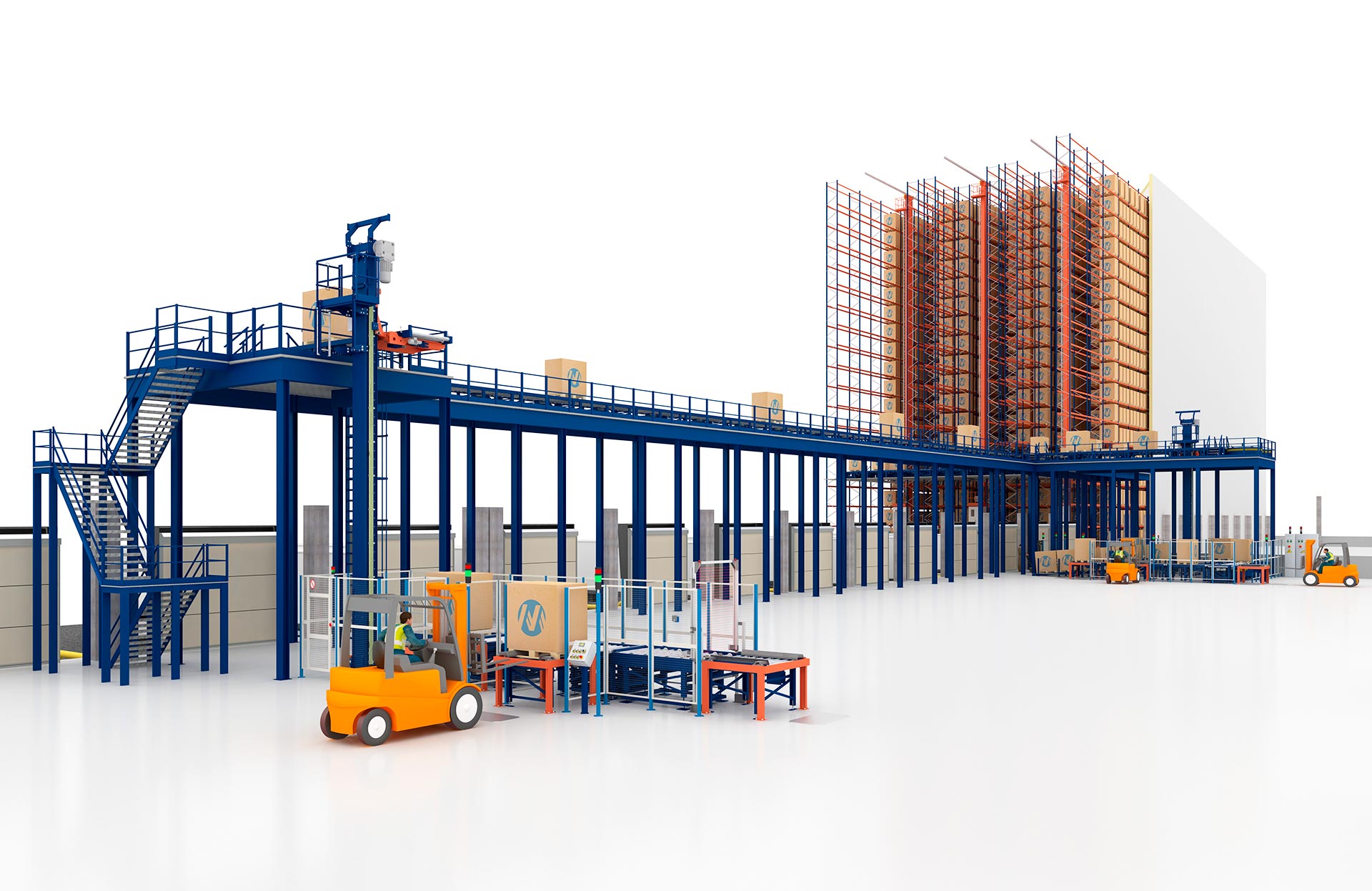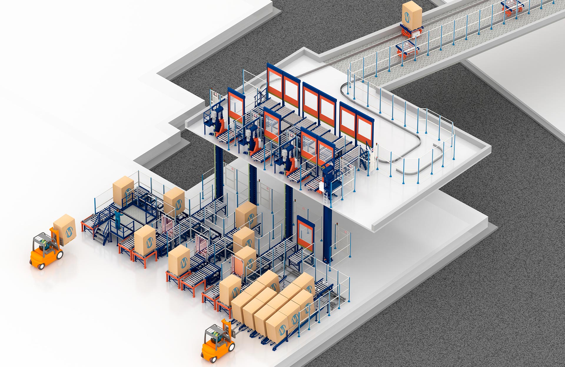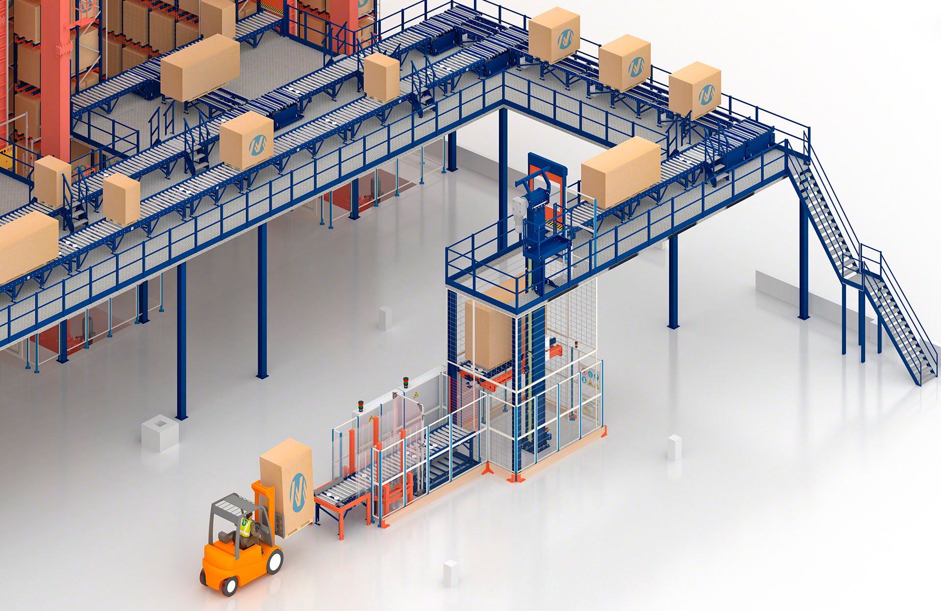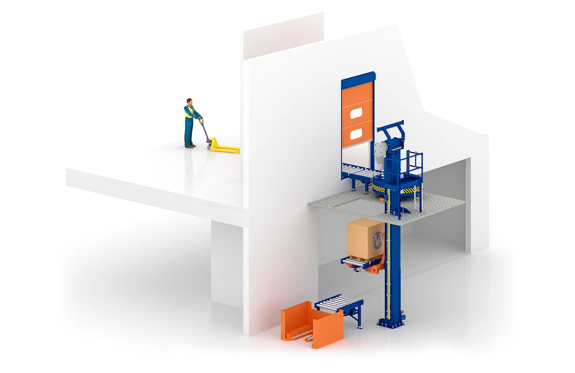 Vertical transport system that automates pallet lifting and lowering to overcome heights and streamline the internal flow of goods.
