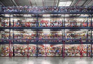 Multi-tier shelving can be installed as stand-alone storage systems or as part of a structural system with automatic elements such as box conveyors. These run along the various levels of the warehouse and end on the lower level at the consolidation and dispatch area.