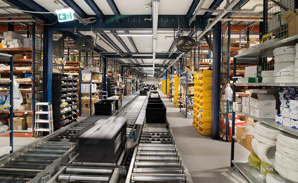 The operators, working by zones, use the roller tables placed on both sides of the circuit to prepare the orders with the products they collect from the shelves. Once the order is completed, the operator deposits the box in the central circuit so that it reaches the next zone, where another operator will repeat the same process.