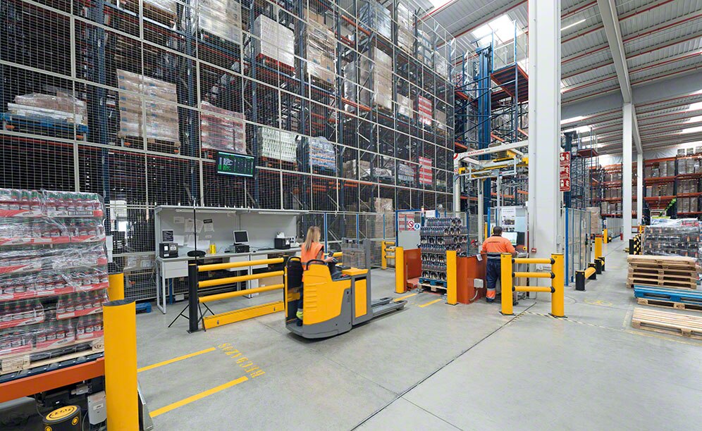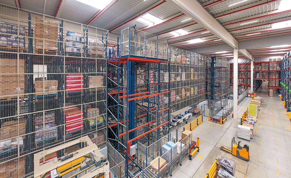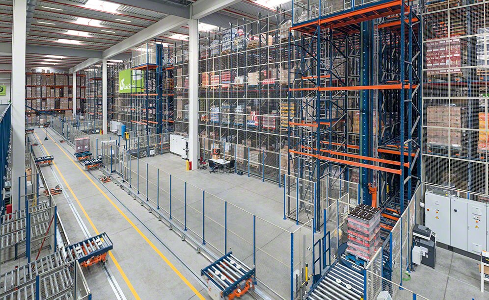 The automated warehouse consists of two 12.6 m high blocks of racking, with four storage levels that can hold six pallets deep. It has storage capacity for 2,556, 1,200 kg pallets.