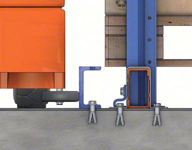 The space between the guides for the aisles is filled with concrete, forming an island on which the racking units sit.