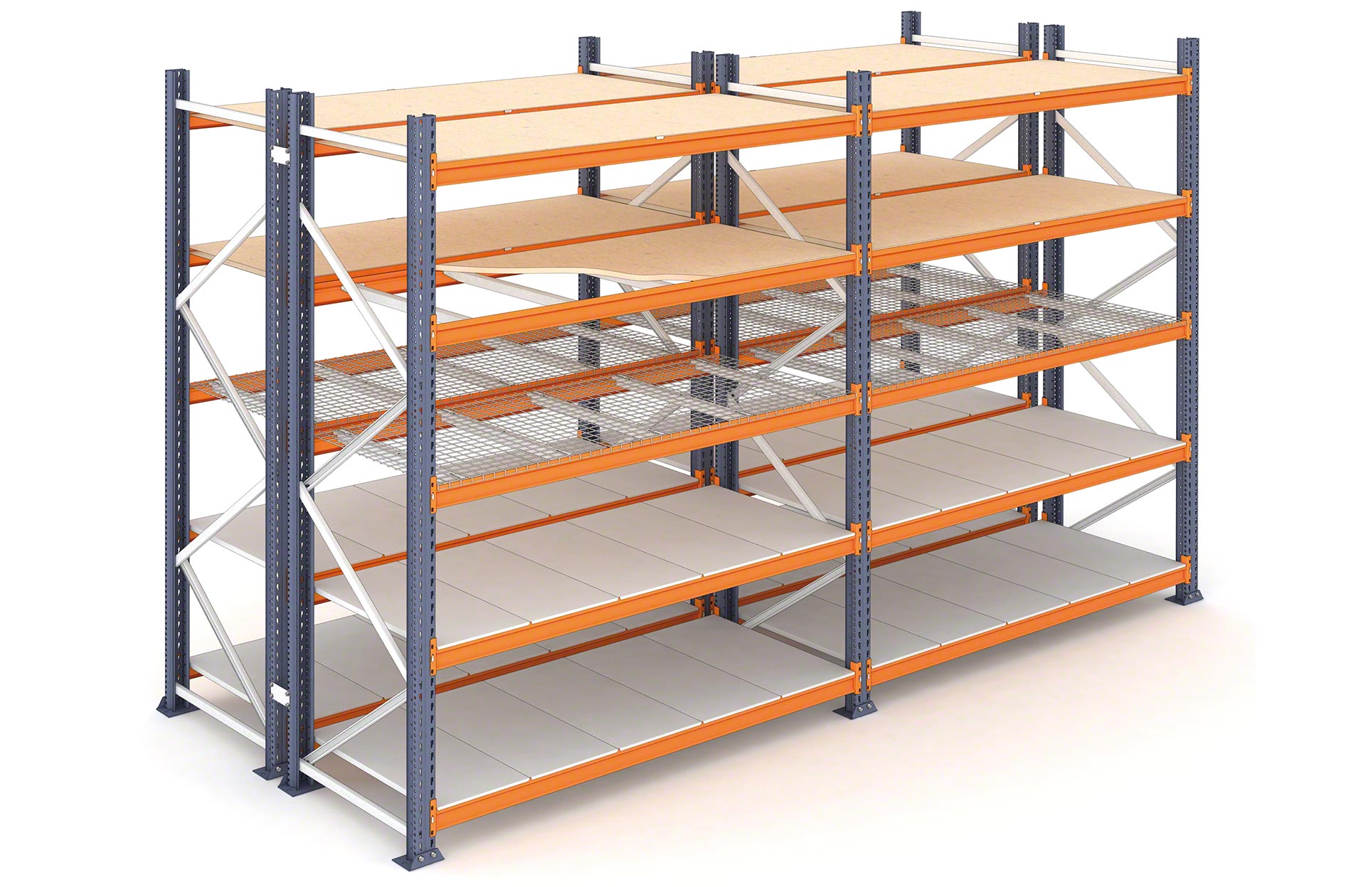The shelves constitute the flat surfaces that support goods on the various storage levels. Shelves can be placed on beams or supports and come in different materials and finishes.