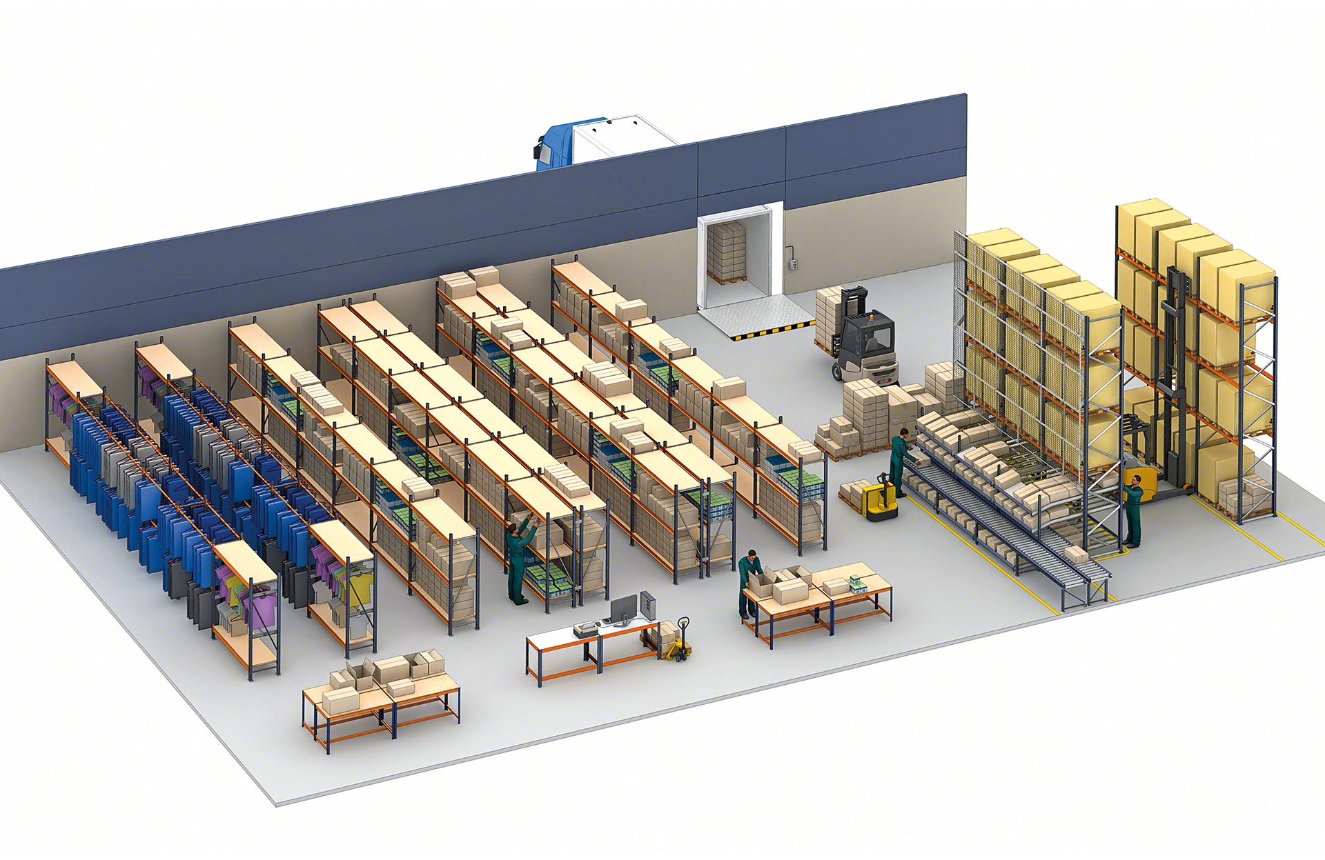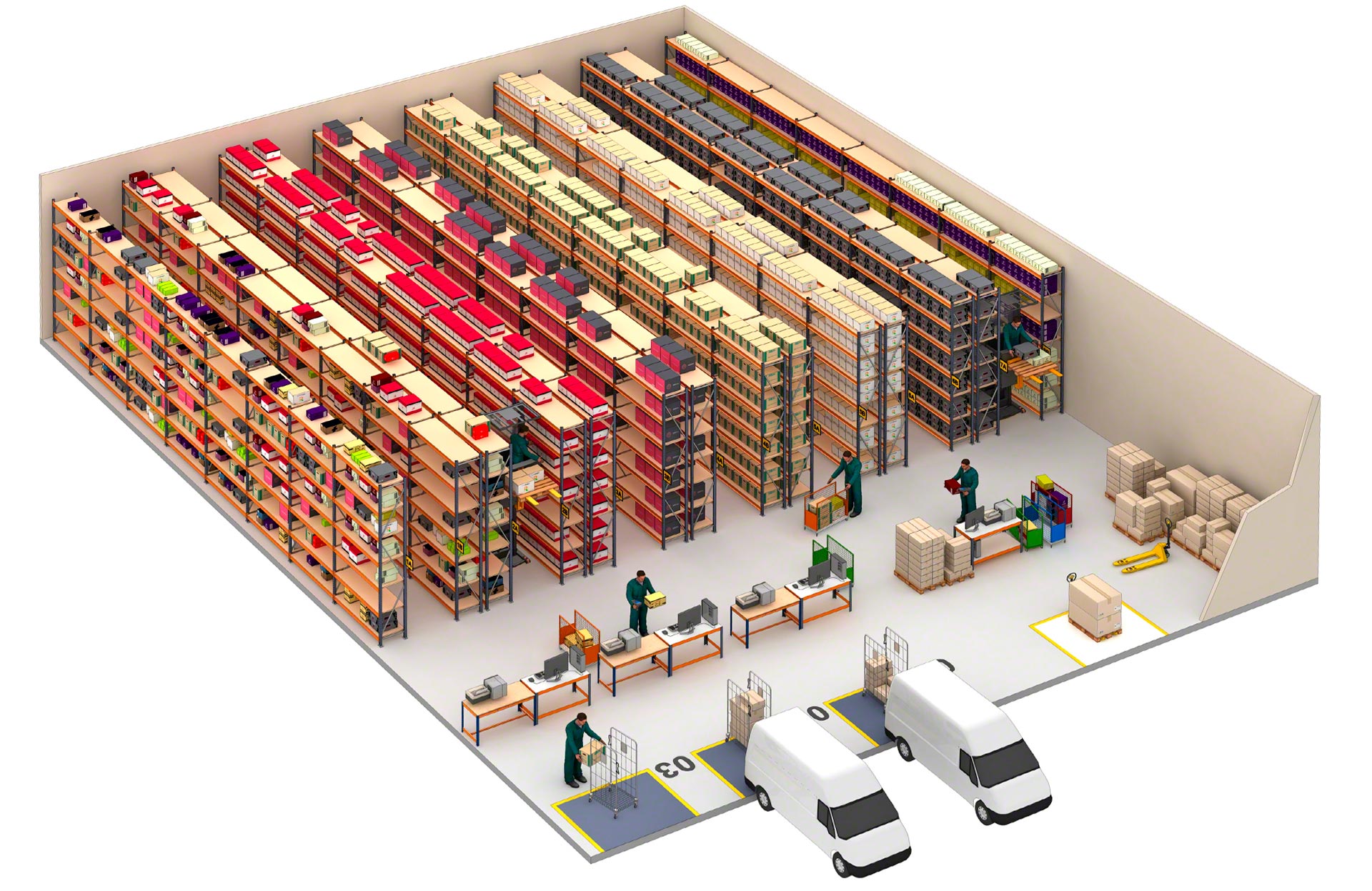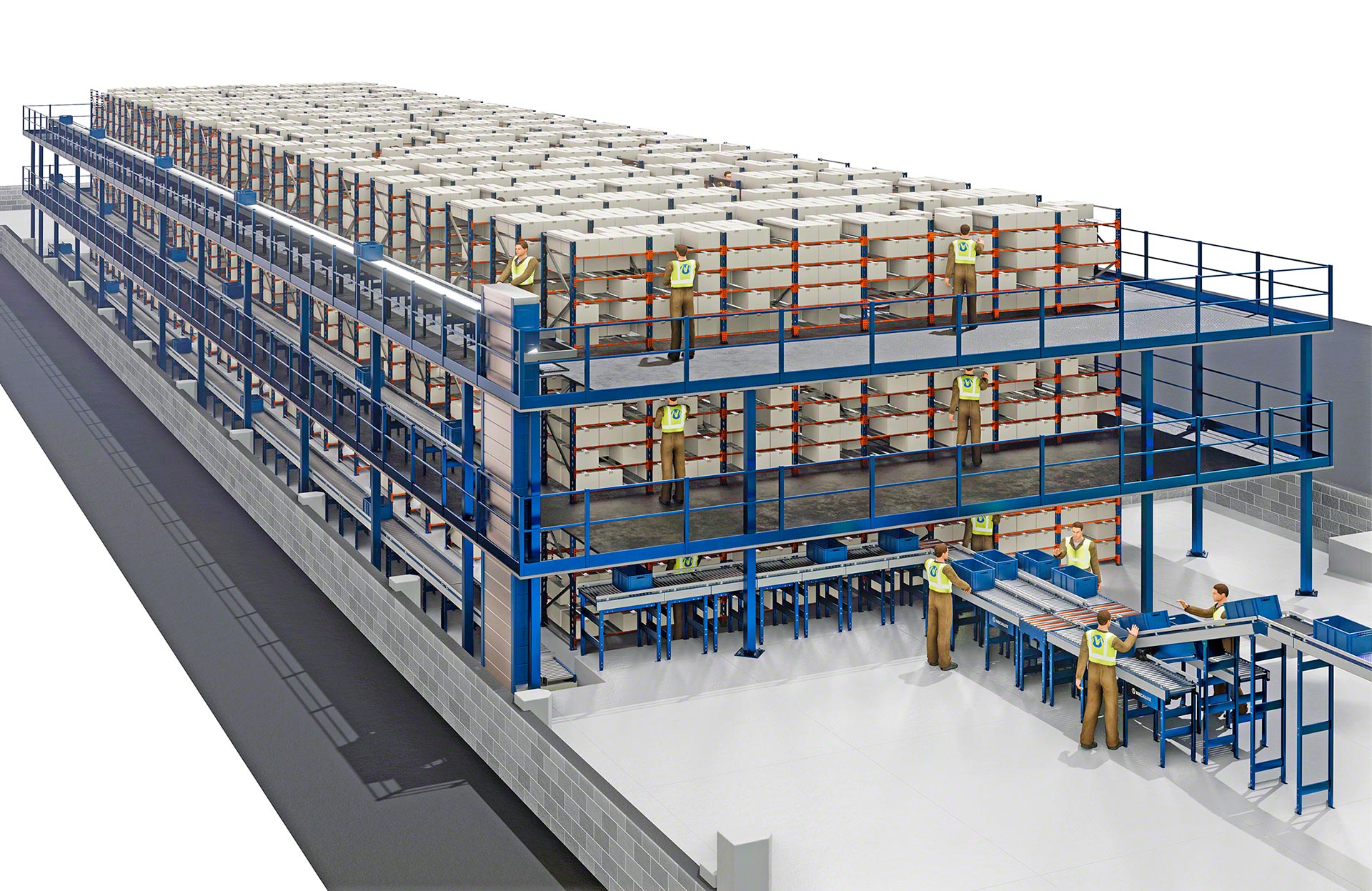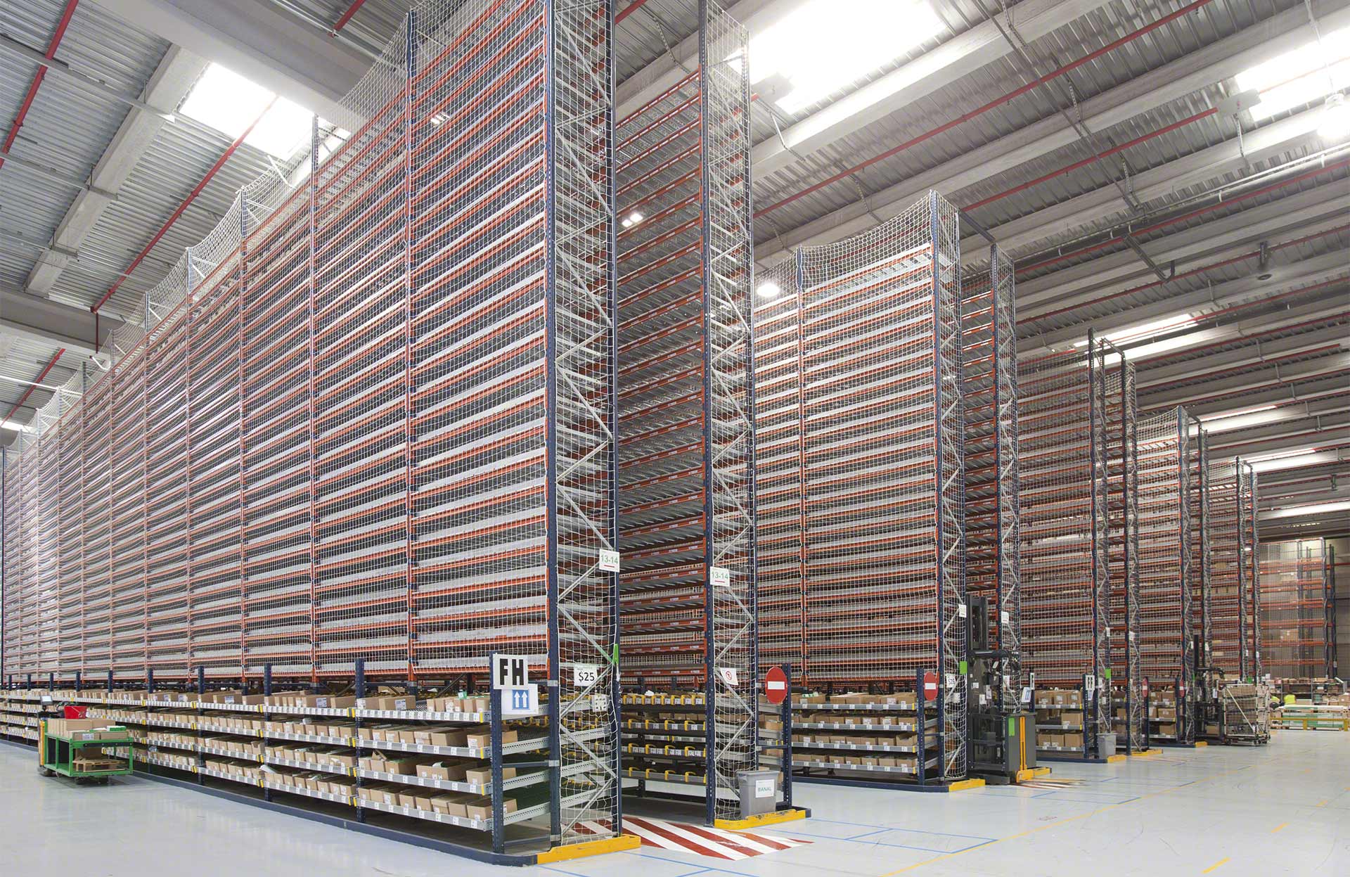 - High-bay storage capacity: racks can be designed up to 12 m high to work with order picker machines and up to 20 m high with access to the upper levels via raised walkways.